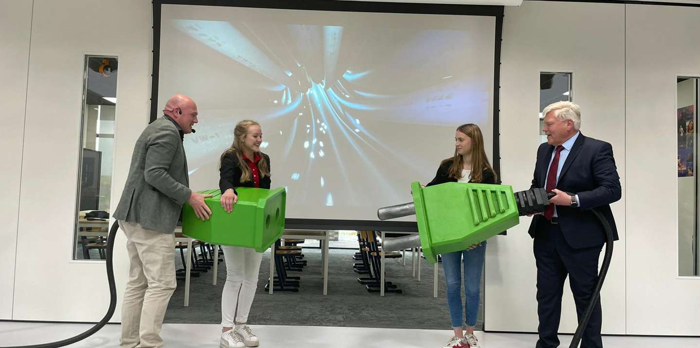 In het traject naar het prachtige, nieuwe gebouw hebben technologie, innovatie en duurzaamheid continu centraal gestaan. Termen die ook bij André Kuipers niet onbekend zijn. Op een boeiende manier voerde hij de aanwezigen mee langs de geschiedenis van de ruimtevaart, zijn ervaringen als astronaut, de onderzoeken, de vernieuwingen op allerlei gebieden en het belang van duurzaamheid omdat de aarde steeds verder beschadigd raakt. Daarna opende hij samen met leerlingen en directeur Charles Lohnstein officieel het schoolgebouw door een duurzame stekker aan te sluiten.